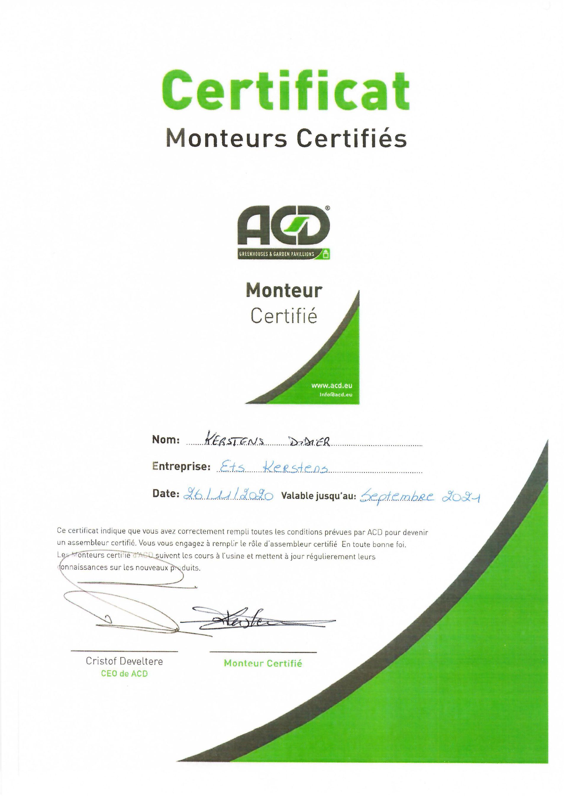 Depuis presque 10 ans, Les Ets KERSTENS D - Easy Home & Garden parcourent la Belgique et la France pour installer votre serre ACD.
